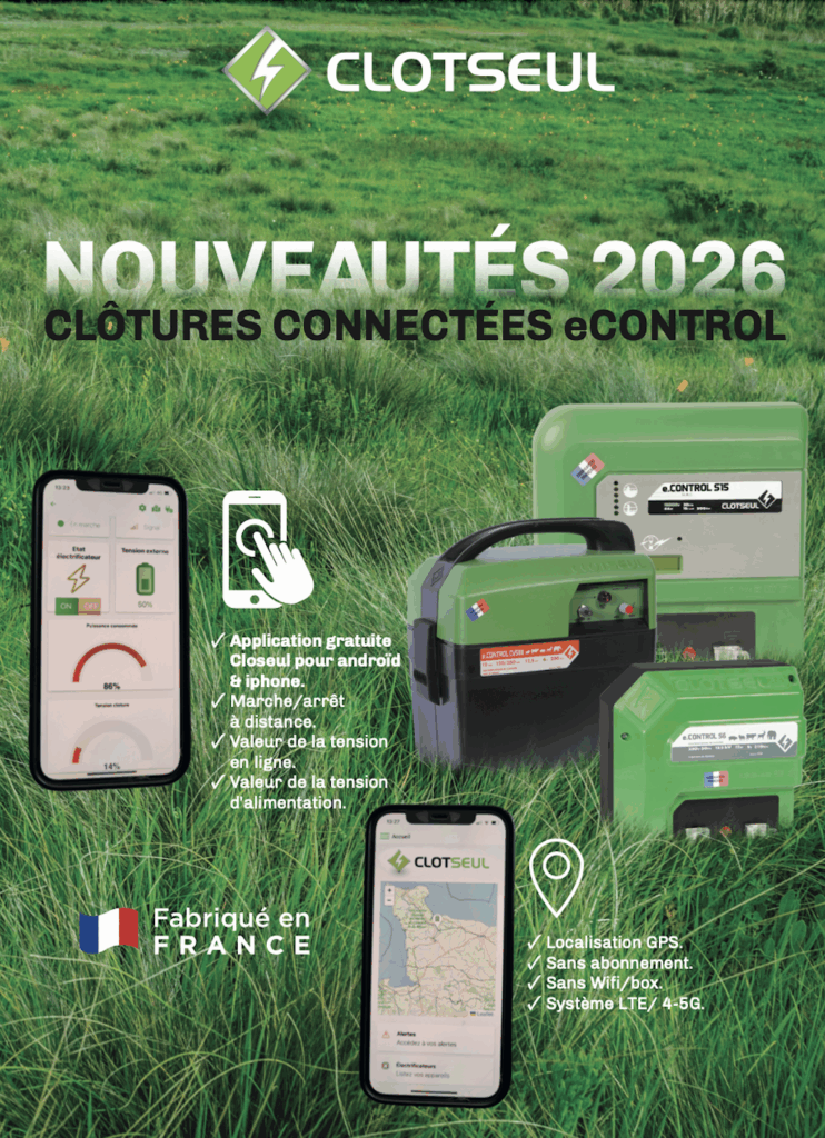 Première entreprise Française de fabrication d’électrificateurs de clôture électrique, dès 1938, la marque CLOTSEUL, propriété de CHAPRON LEMENAGER SAS, a toujours été reconnue pour l’immense fiabilité de ses postes de clôture. En 2026 CLOTSEUL fait un pas en avant vers la modernité exigée des éleveurs, en proposant quatre électrificateurs de clôture électrique dotés d’une connexion via une application dédiée permettant à l’éleveur de piloter à distance une totale une et même de plusieurs clôtures électriques.