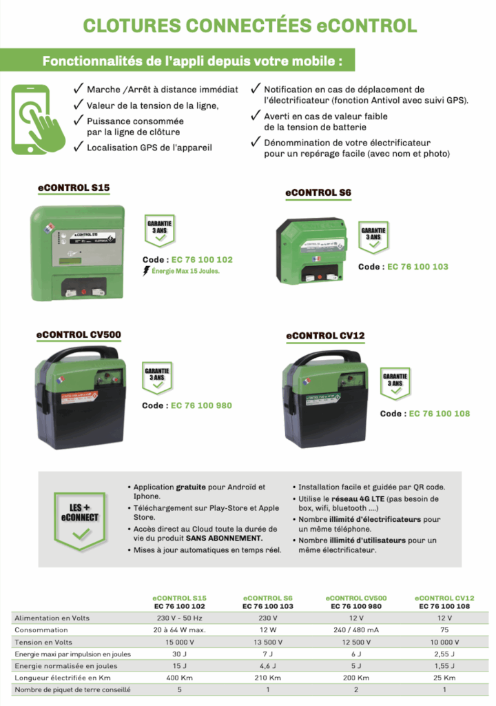 Ces quatre électrificateurs qui seront disponibles au début de 2026, seront exposés dès ce mardi 7 Octobre au SOMMET de L’ÉLEVAGE dans le Hall 1, Allée D, N° 110 et ce jusqu’au 10 Octobre 2025. Nous serons heureux de vous présenter cette gamme connectée lors de votre visite sur notre stand. En attendant voici ci-dessous toutes les informations techniques sur les postes eCONTROL par CLOTSEUL (eCONTROL est une marque déposée de CHAPRON LEMENAGER SAS).